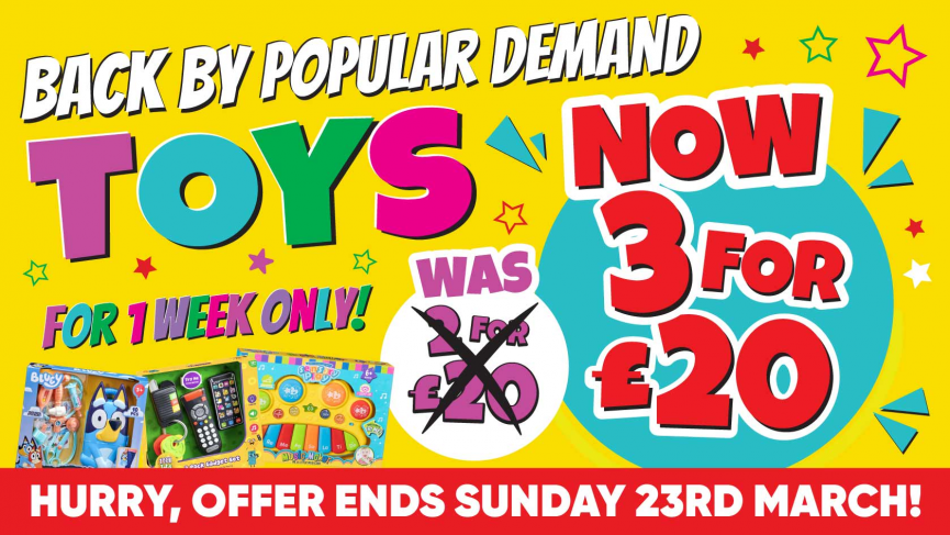The B&M 3 for £20 toy sale has always been a popular sale and one that we normally see around Christmas time only. However because of the popularity of the toy sale B&M have brought it back today!