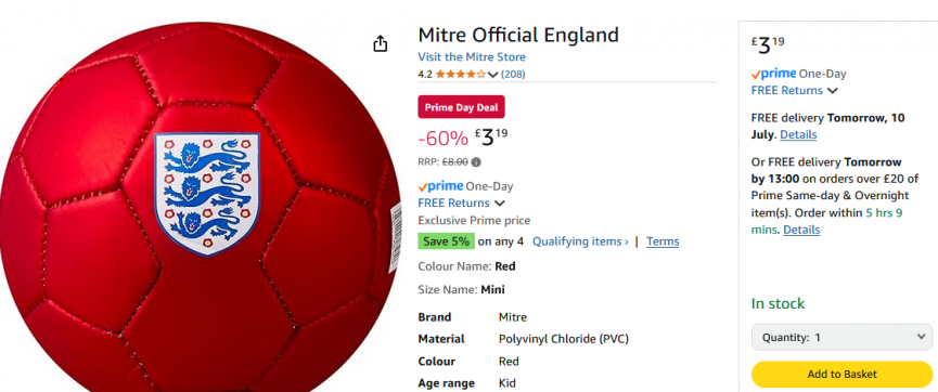 This is a cracking little buy as part of Amazon's Prime Day deals! You can get this Mitre Official England Mini Football for just £3.19 down from the £8 RRP. This deal is exclusively for Amazon prime members, sign up for a free 30 day trial here* and start saving straight away!