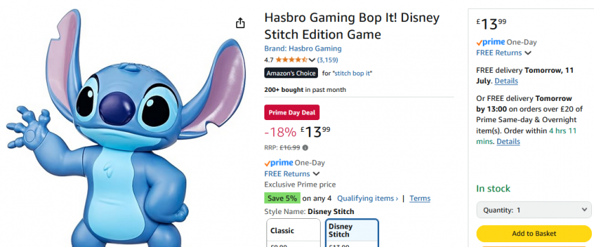 have for any little fan. Especially if they love a game of Bop It! This Disney Stitch Bop It! Game is new out but it has just been added to the Amazon Prime Day deals! It can be yours for only £13.99 instead of £16.99. Not a Prime member?