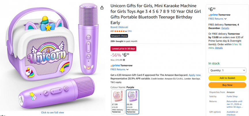 This Unicorn Karaoke Machine with 2 microphones makes the perfect Christmas present for a little one who loves to sing and perform! It's such a bargain price right now at Amazon. Get it for just £6.99 via Amazon seller Funle Shop, what a bargain!