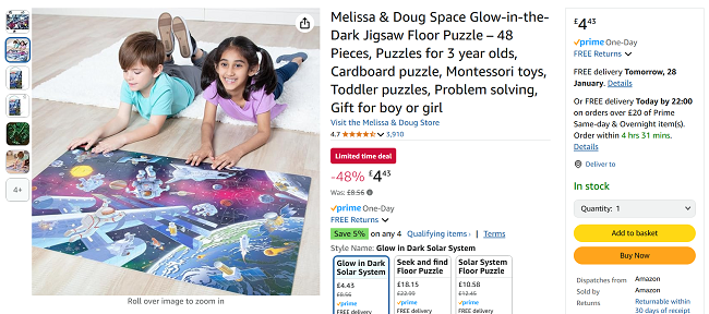 This is a super deal for a kids puzzle, as Amazon have this Melissa & Doug Space Glow-in-the-Dark Jigsaw Floor Puzzle reduced to just £4.43 as a Limited Time Deal when it's still selling for £20 at JoJo Maman Bebe!