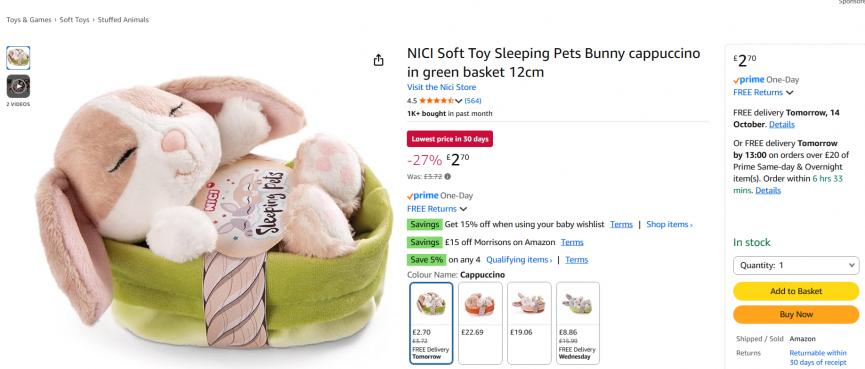 Now this is a nice little stocking filler or Christmas gift over at Amazon. We spotted this NICI Soft Toy Sleeping Pets Bunny for only £2.70, other colours are selling for almost up to £22.69 so this is a huge bargain! We have a feeling it is going to sell fast.