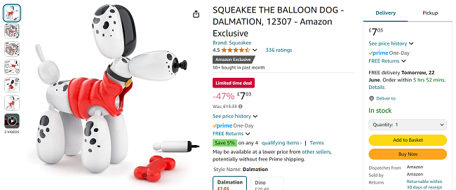 Here's a super bargain toy as Amazon have this Squeakee The Balloon Dog Dalmatian for just £7.03 right now. That's by far the cheapest we have seen it and with free Prime delivery too so we think it's going to go fast!