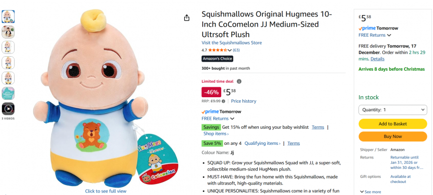 This is a must have for a little CoComelon fan this Christmas! You can get the Squishmallows Original Hugmees 10" CoComelon JJ Plush for just £5.38 instead of £9.99 at Amazon. There's also free delivery for Amazon prime members too.