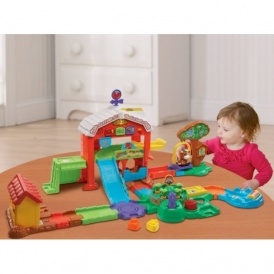 This interactive farm play set features nine 'Smartpoint' locations which respond to the Toot Toot animals with fun phrases, animal and nature sound effects and melodies. There are three press buttons to teach colours, vegetables and numbers. The farm has a swinging door that plays a fun mouse sound effect when the animal passes through it, a slide that the animals can slide down into the farm, a swing, a rotating eating trough and a vegetable garden. The farm plays three sing-along songs and fifteen melodies and you get a Toot-Toot Animals electronic cow in the set to start you off. It's suitable for children aged 12 months up to around 5 years.