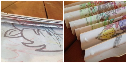Next, fold each sheet in a zig zag, forward-backward-forward pattern at the width of the lollipop stick, all the way through the picture. At the bottom of each page, pop a drop of glue in each 'zig-zag', and press the folds together.