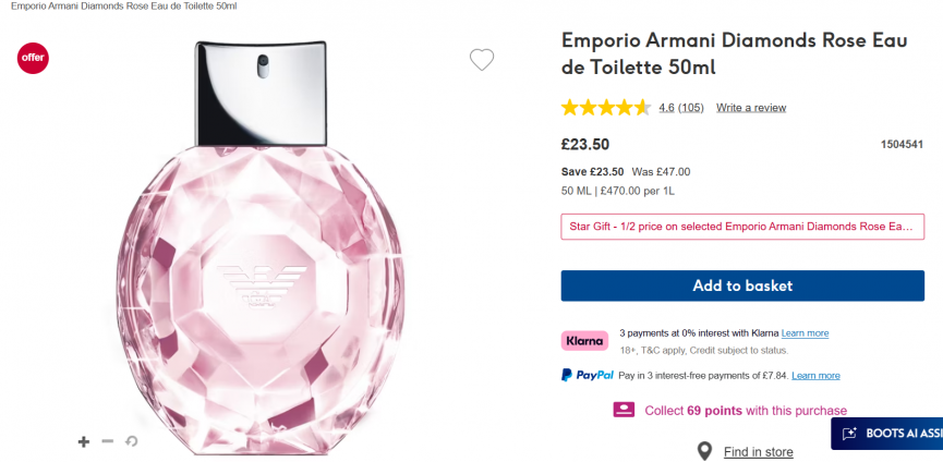 This is an absolute bargain price for a 50ml bottle of designer perfume, I have a feeling it is going to sell quickly! Boots have the Emporio Armani Diamonds Rose Eau de Toilette 50ml down to just £23.50 from £47! It's not often you can get a 50ml bottle of perfume by Armani for less than £25!