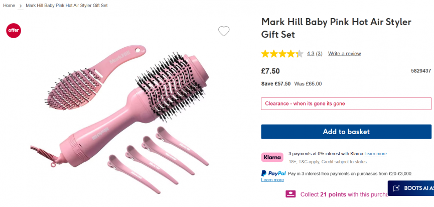 Now this is a bargain that we had to do a double take when we saw it! We have found the Mark Hill Baby Pink Hot Air Styler Gift Set at Boots with a whopping £57.50 off! It is in the Boots clearance for £7.50 when the original price was £65! This is going to fly out!