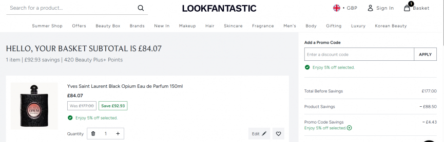 Wow, this is an absolute bargain if you like the YSL Black Opium Eau de Parfum. The huge 150ml is normally £177 but we have found it on offer at LOOKFANTASTIC with 50% off! However add the discount code 5OFF at the checkout and you will get an extra 5% off making it just £84.07 with free delivery! The next best price is at Boots, it is on offer for £132.75.