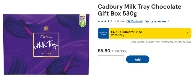 If you're a fan of Cadbury chocolates you'll want to keep your eye out for this bargain at Tesco, as they have the big Cadbury Milk Tray Chocolate Gift Box 530g on offer for just £4.50 with your Clubcard. It's a limited time deal for Valentine's Day and runs from today until 14th so you'll need to be quick!